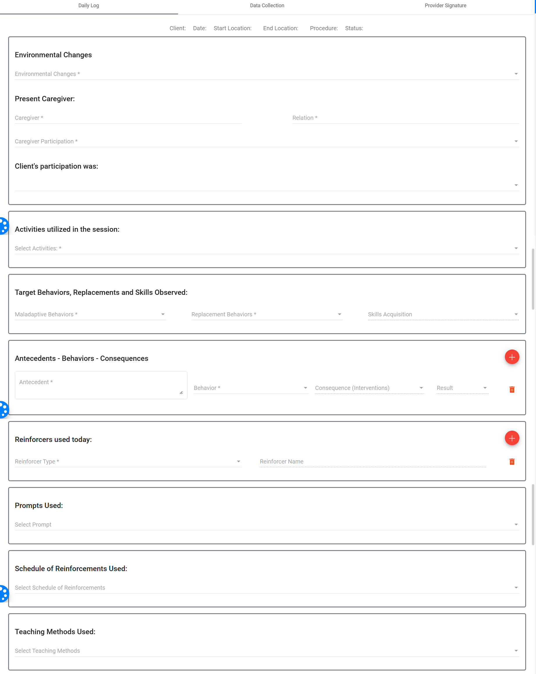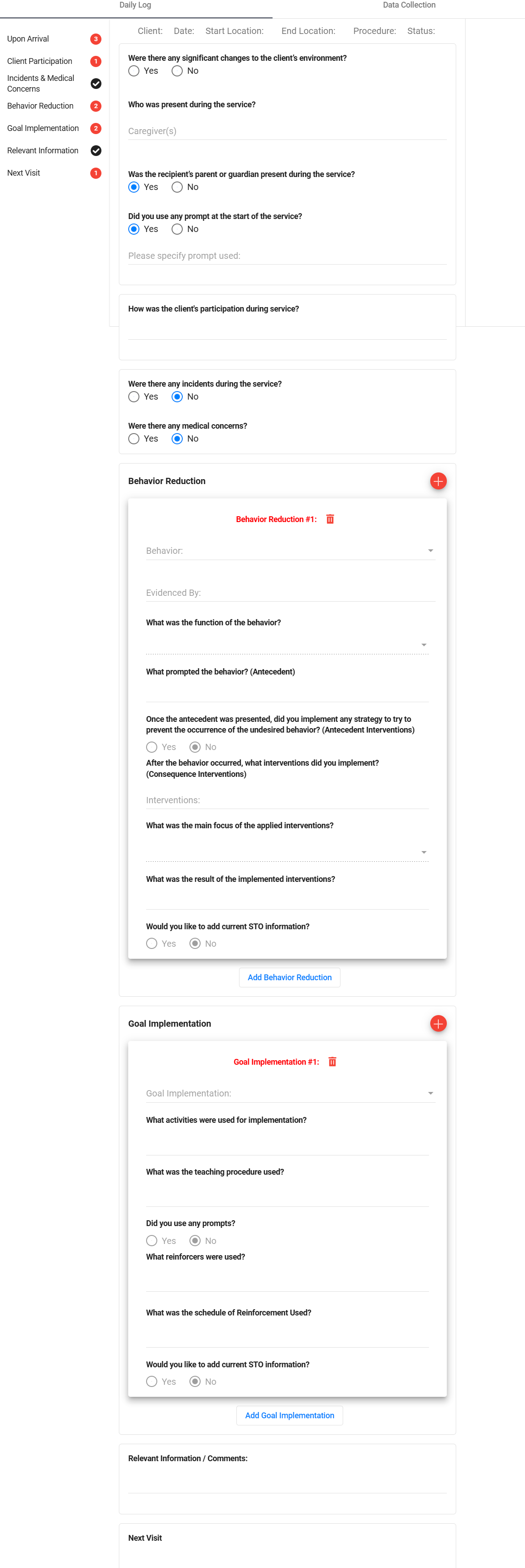 Form used by clinics that document behavior reduction and goal implementation per session, with cascading field logic per behavior.